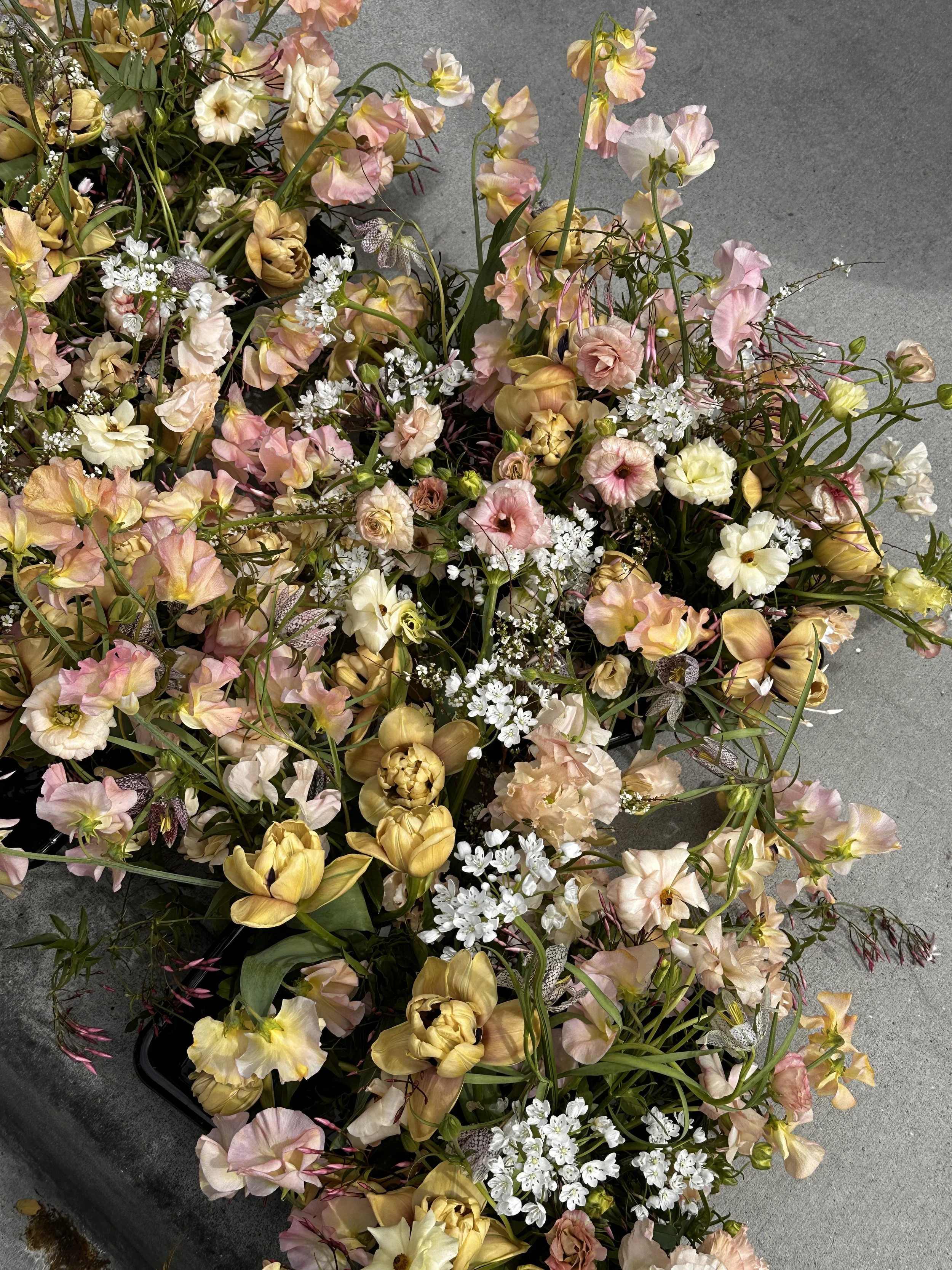 In contrast to the ceremony, the reception featured soft tones filled with the best of spring flowers. Magnolias paired beautifully with spirea and jasmine, while sweet peas, Belle Epoque tulips, and fritillaria brought a lush, seasonal charm to the tables.