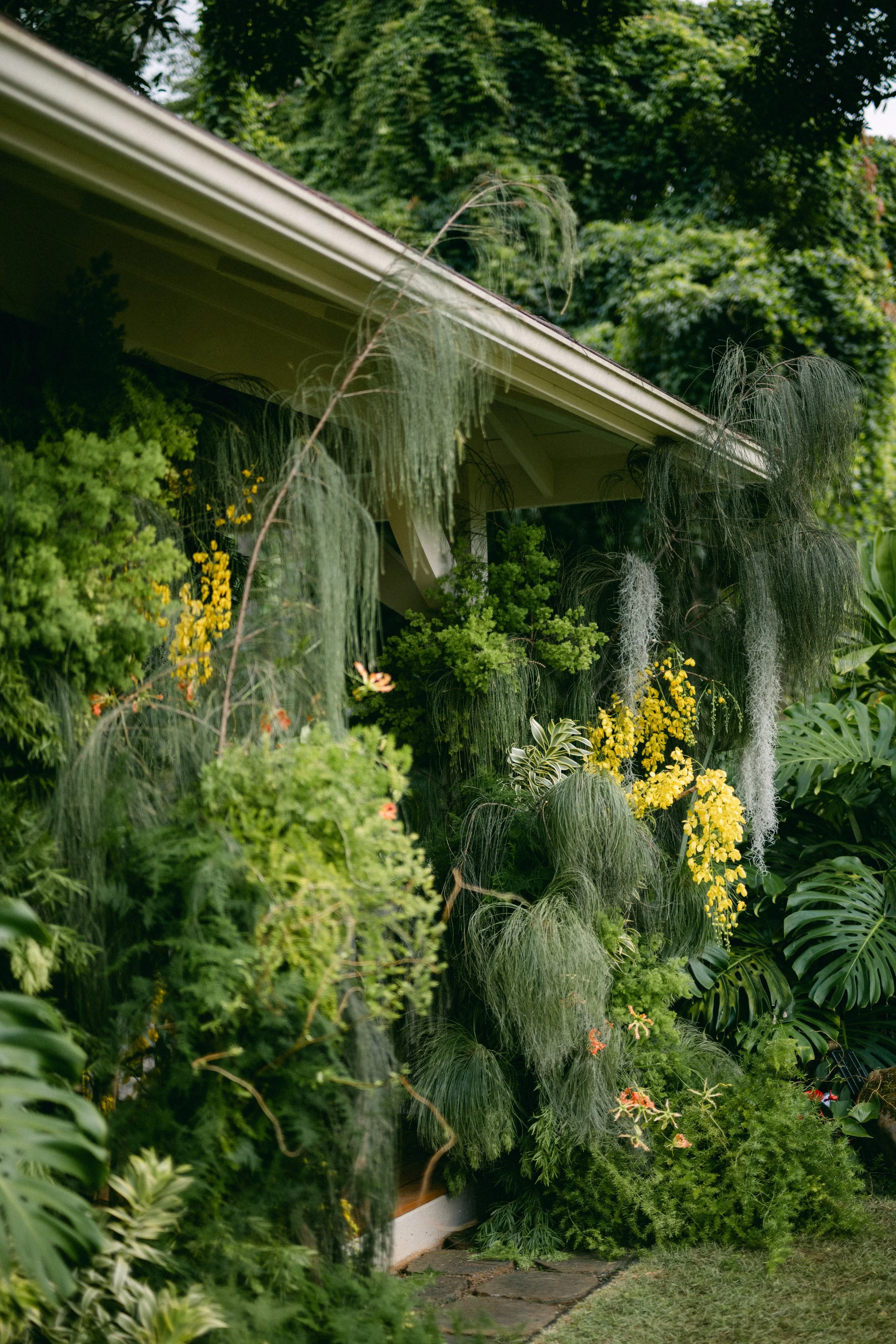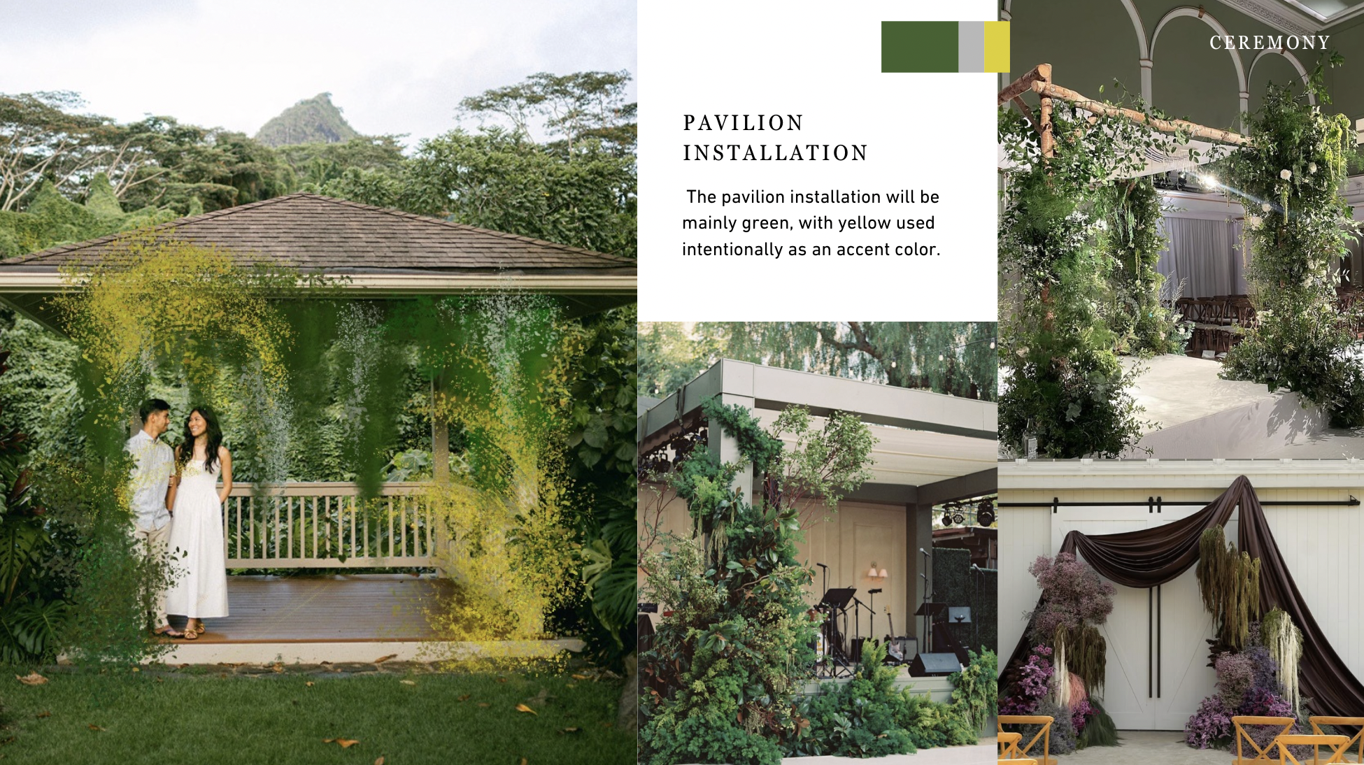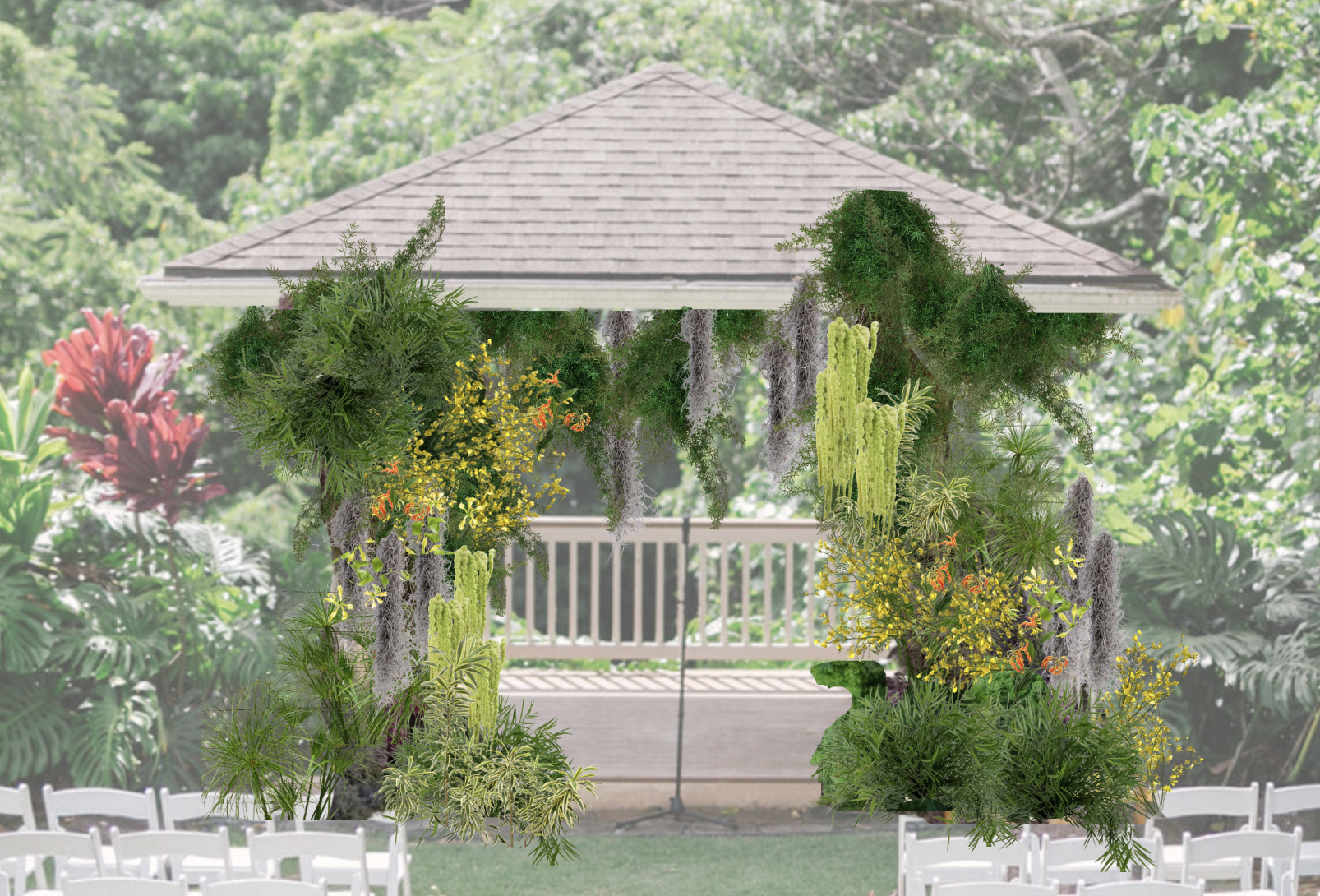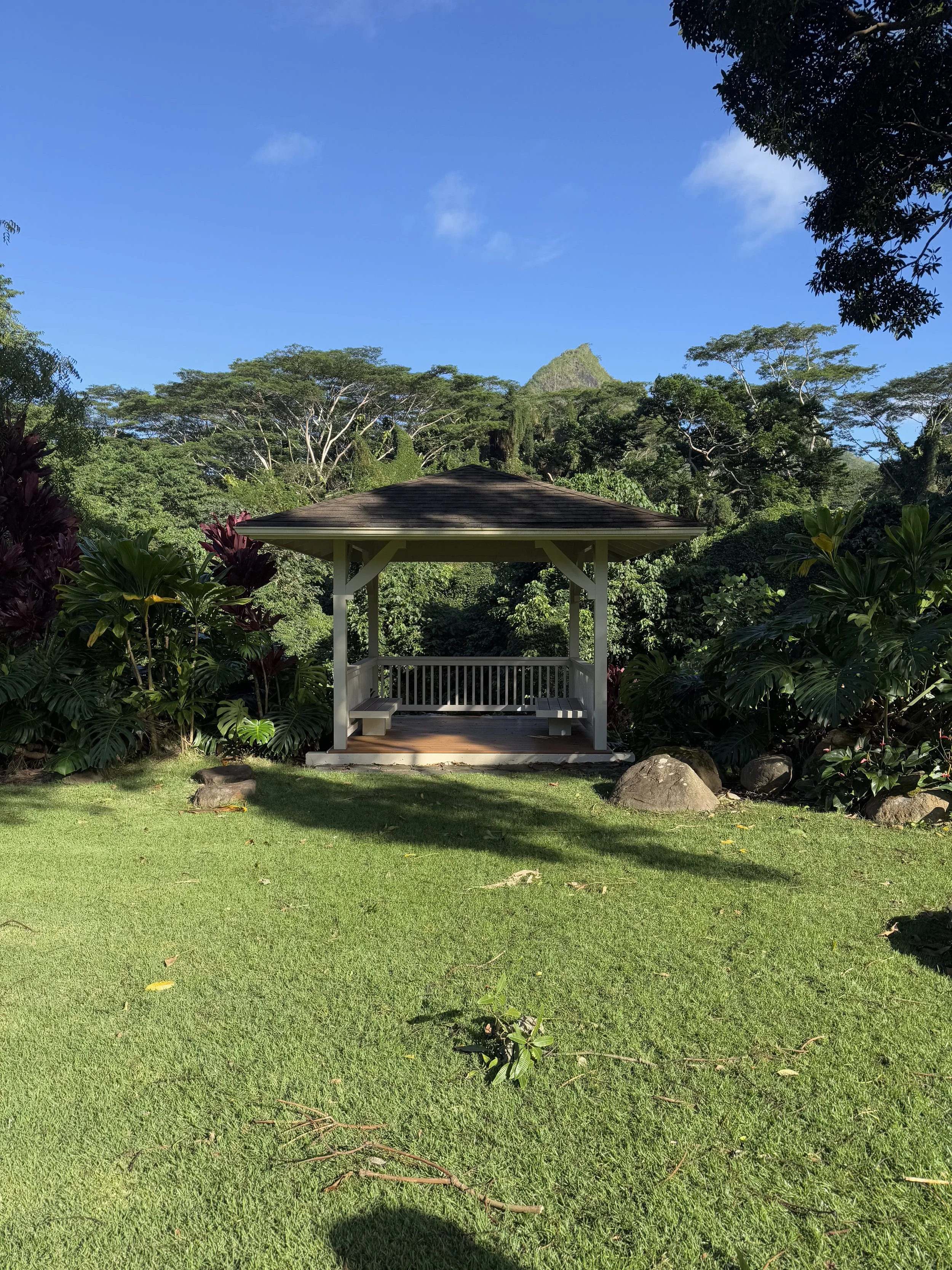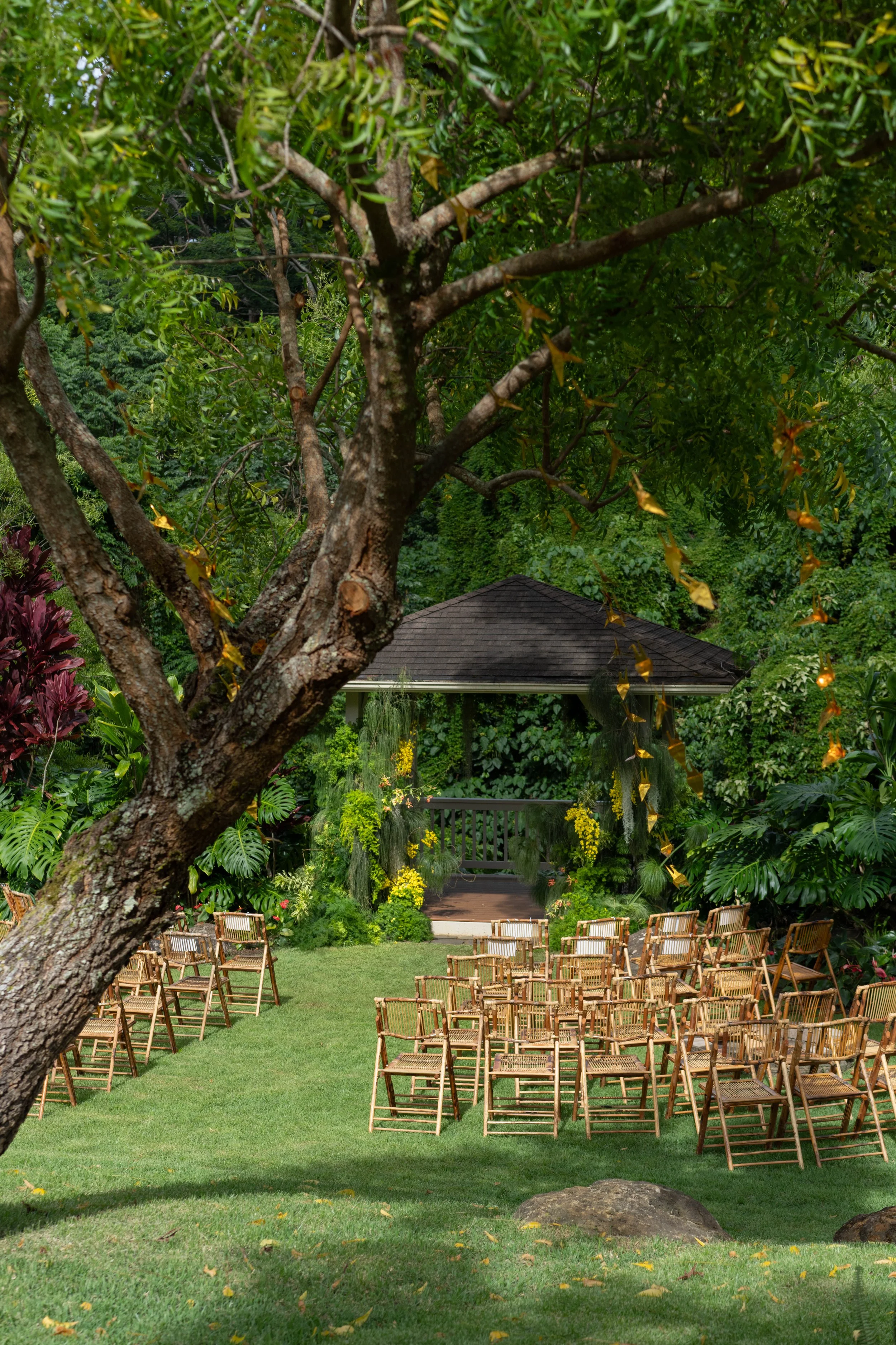 With the bride drawn to layers of green, we chose to blend rather than compete — shaping a ceremony backdrop that felt rooted in place, present, and naturally part of Maunawili itself.